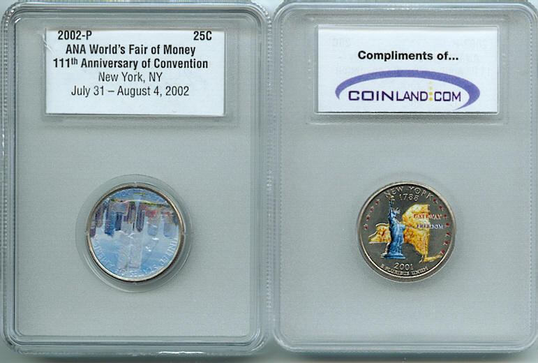 Coinlandhttp://www.coinland.com/ Internet Archive: 2000-2017This company does not have a normal production slab and does not grade coins like the other certification services. They did give out samples though at the 111th ANA Anniversary convention in New York (July 31-August 4 2002) and has their website: www.coinland.com on the back.